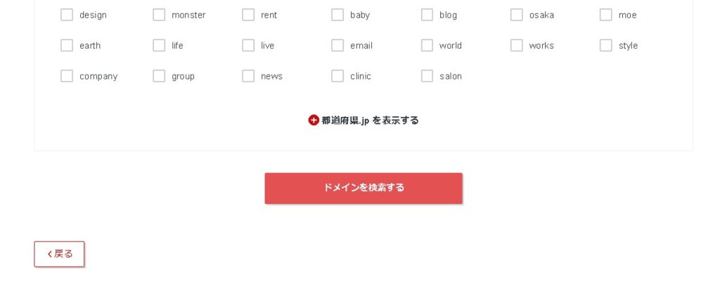 検索したいドメインと、ドットの右側(トップレベル)にチェックを入れたら「ドメインを検索する」を押します。