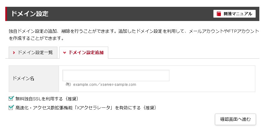 「ドメイン設定追加」から、先ほど取得したドメインを入力して「確認画面へ進む」をクリックします。