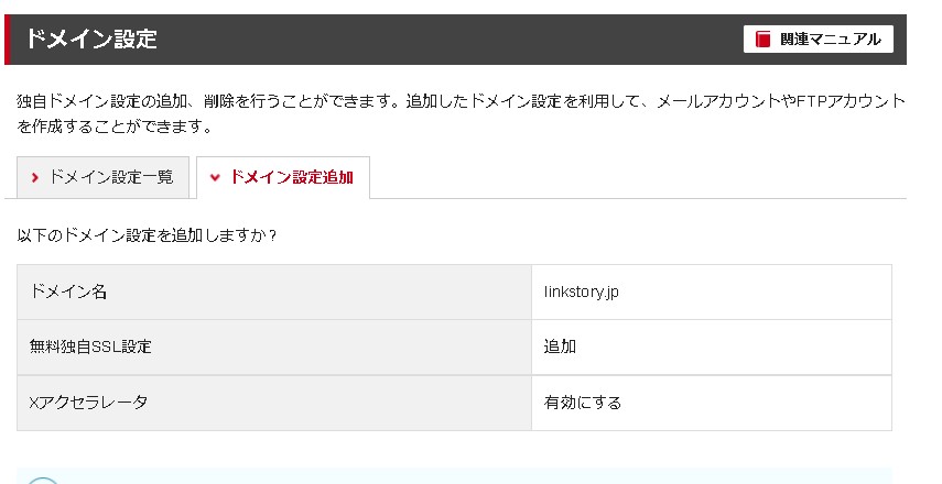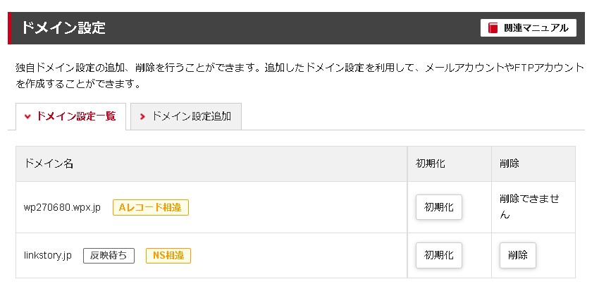 ドメイン設定一覧を開くと、今設定したドメインが追加されています。