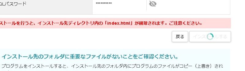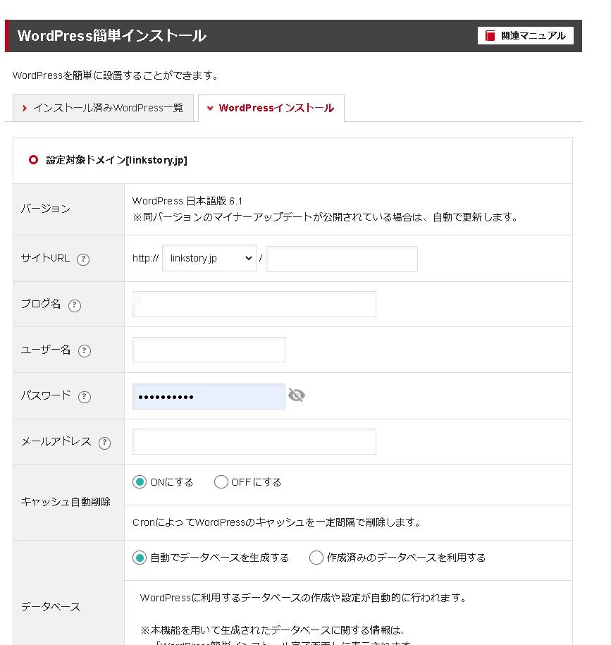「WordPressインストール」のタブに切り替えたら、設定を行っていきます。