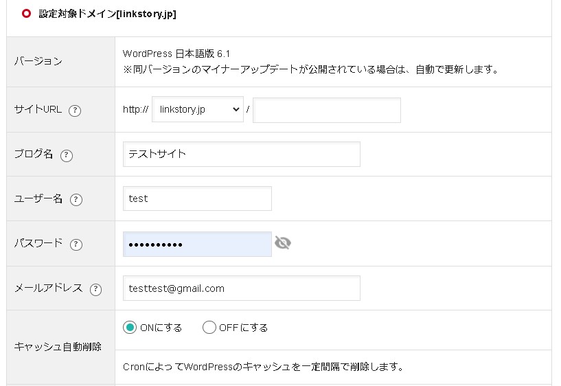 サイトURLはWordPressをインストールするドメインを選択します。※誤って既にインストールしているドメインを選択してしまうと初期化されてしまうので、くれぐれも注意しましょう。