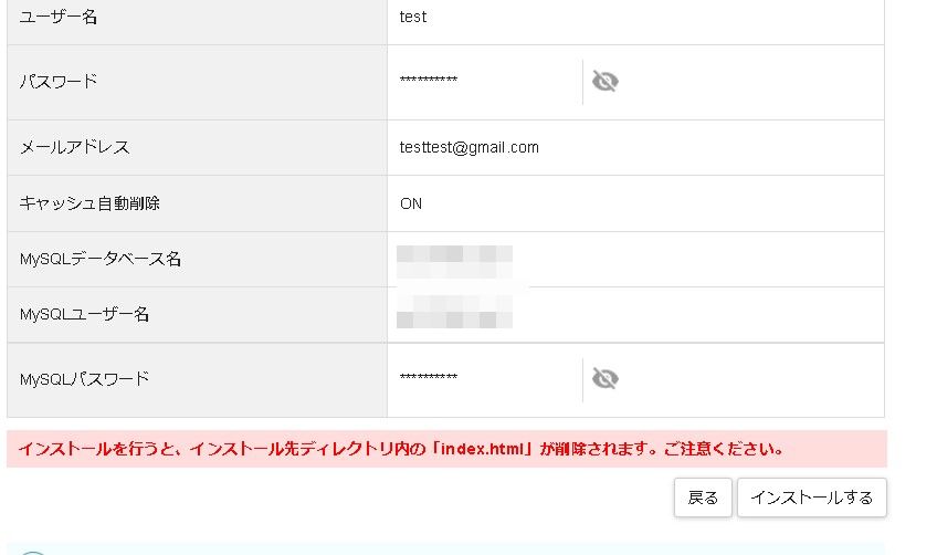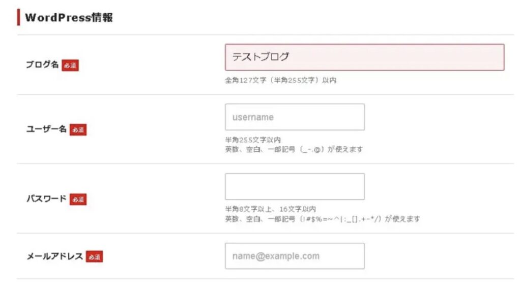 あとは、ブログ名(ホームページ名)、ワードプレスにログインする時の「ユーザー名」「パスワード」「メールアドレス」をそれぞれ設定します。ブログ名は後で変更出来ますので、ひとまず仮の名称でもOKです。