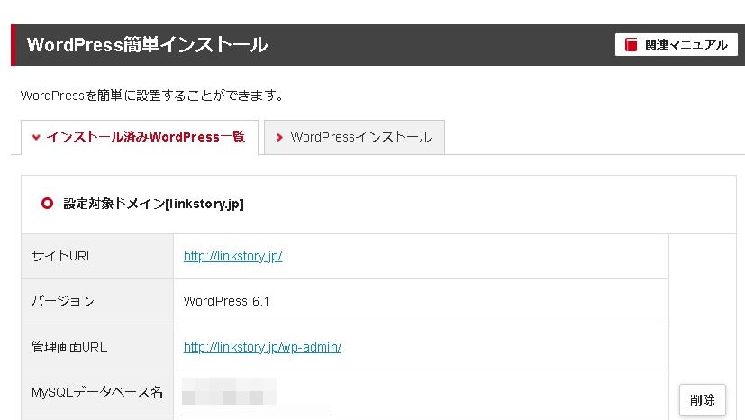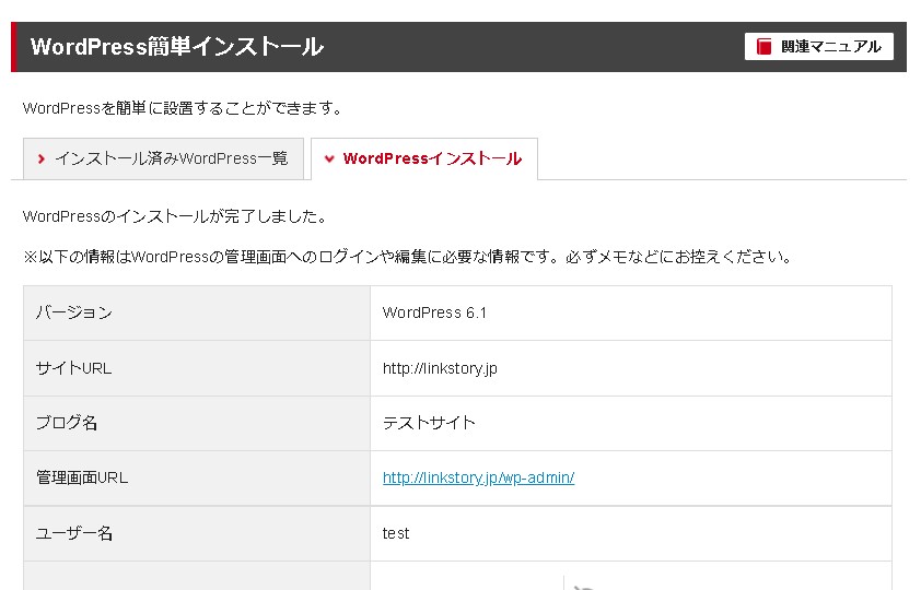 ここまで進めば、ワードプレスのインストール(新規作成)まで出来ている状態になっています。