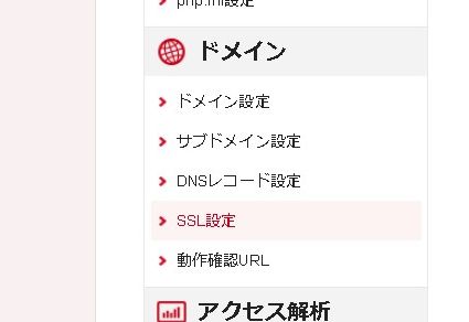 次に、ドメインの「SSL設定」を行っておきましょう。これは、SSL(https://)でサイトにアクセスできるようにするための設定です。設定しなくてもサイトは表示できますが設定しておいた方が望ましいですので、設定しておきます。※既にSSL設定済みになっている場合もあります。