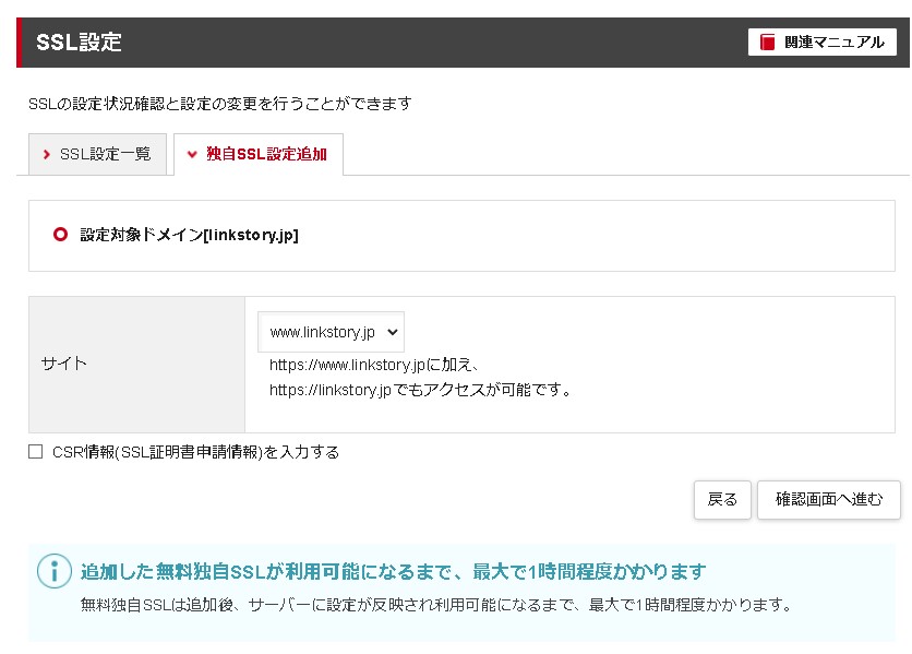 「CSR情報(SSL証明書申請情報)を入力する」の部分は、ひとまず入れなくても大丈夫かと思いますが、必要があればチェックを入れておきましょう。※詳細については別記事にて。